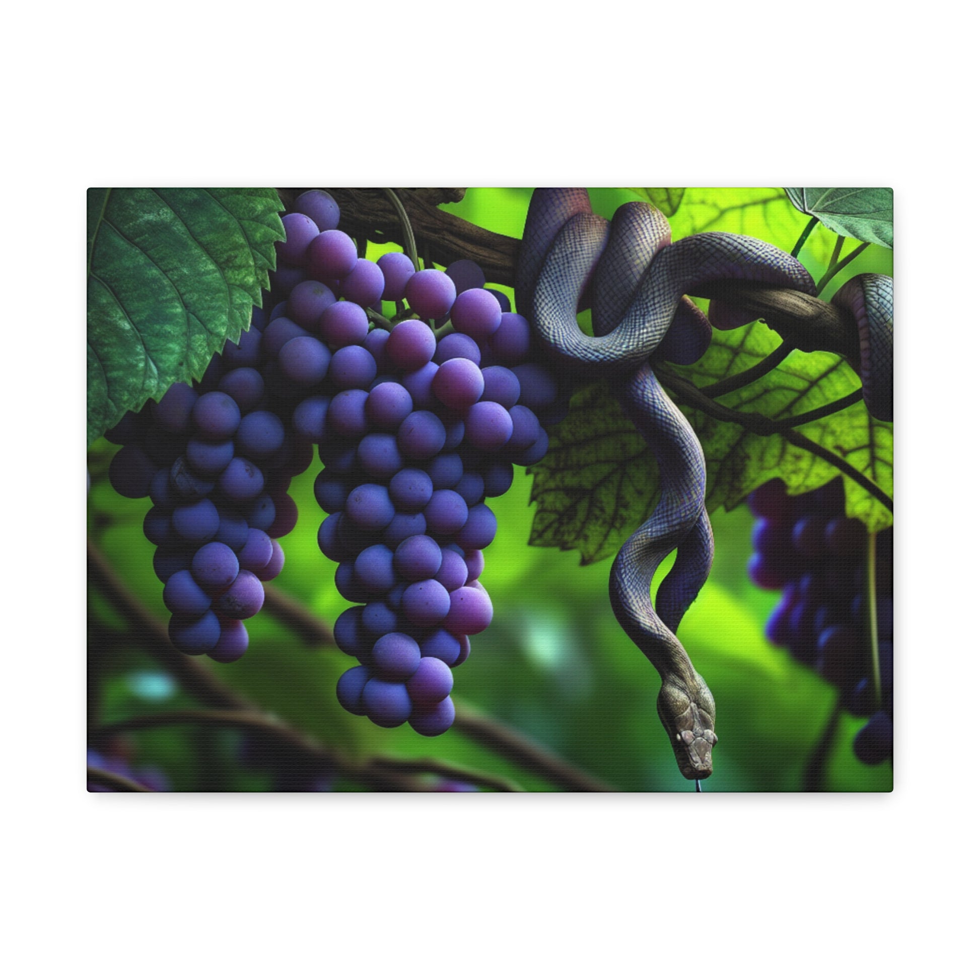 A stunning canvas featuring bright purple grapes with a snake curled around vines, adding a mystical and whimsical touch to any room. Perfect for wine lovers, nature enthusiasts, or those who appreciate unique artwork. Ideal for decorating homes, offices, or wine cellars. Great for birthdays, housewarming gifts, or wine-themed celebrations.
