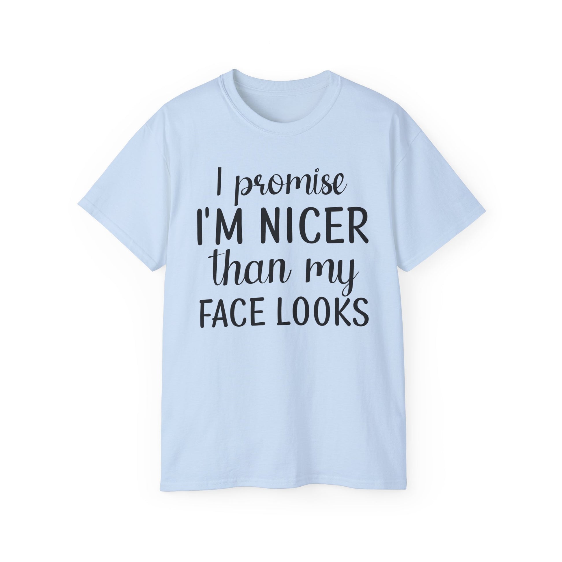 A witty and humorous unisex t-shirt that reads 'im nicer than my face looks'. This shirt gives off a fun and lighthearted vibe, perfect for those looking to add some humor to their everyday wardrobe. Ideal for adults who appreciate clever and playful designs. Suitable for casual wear, hanging out with friends, and can also be a great conversation starter.