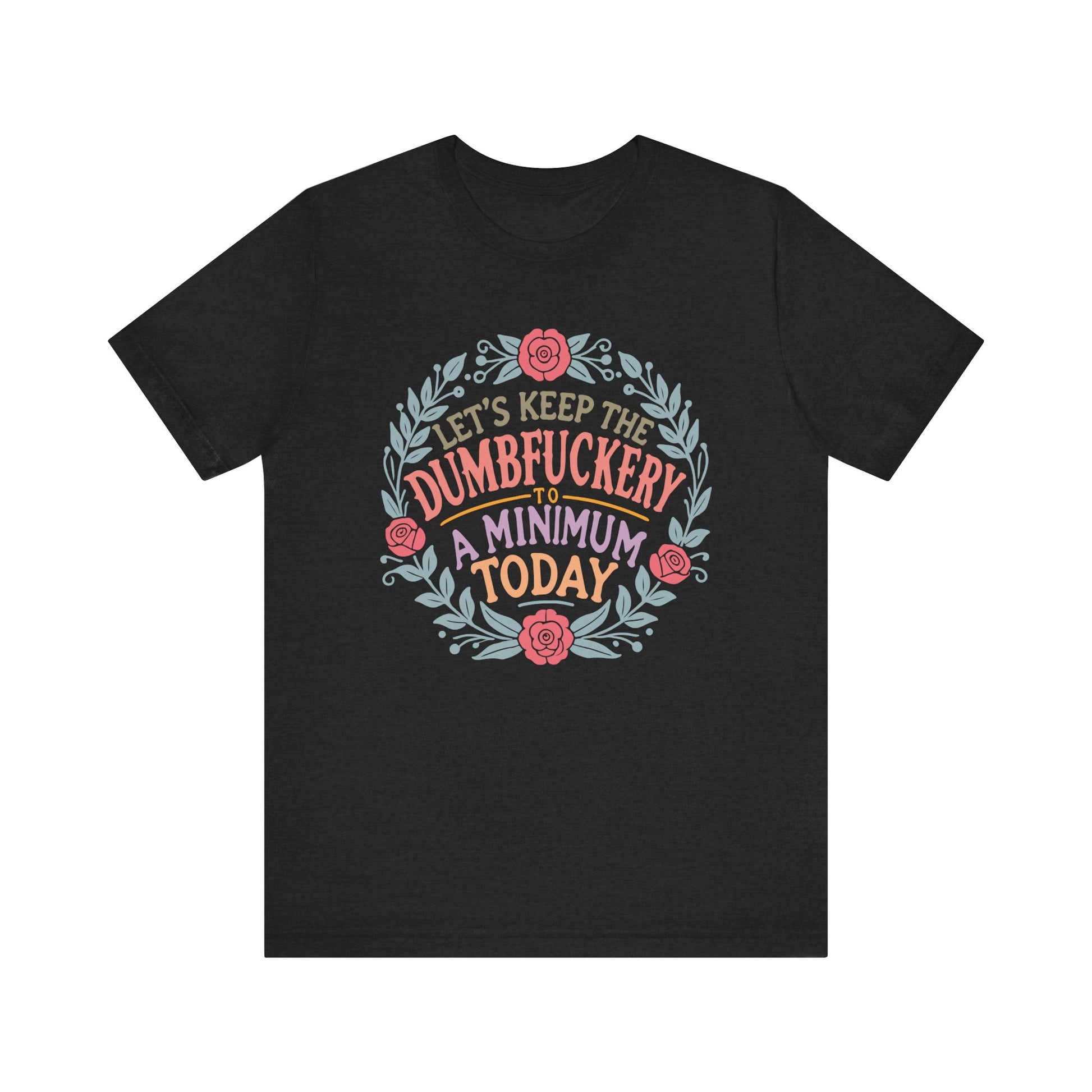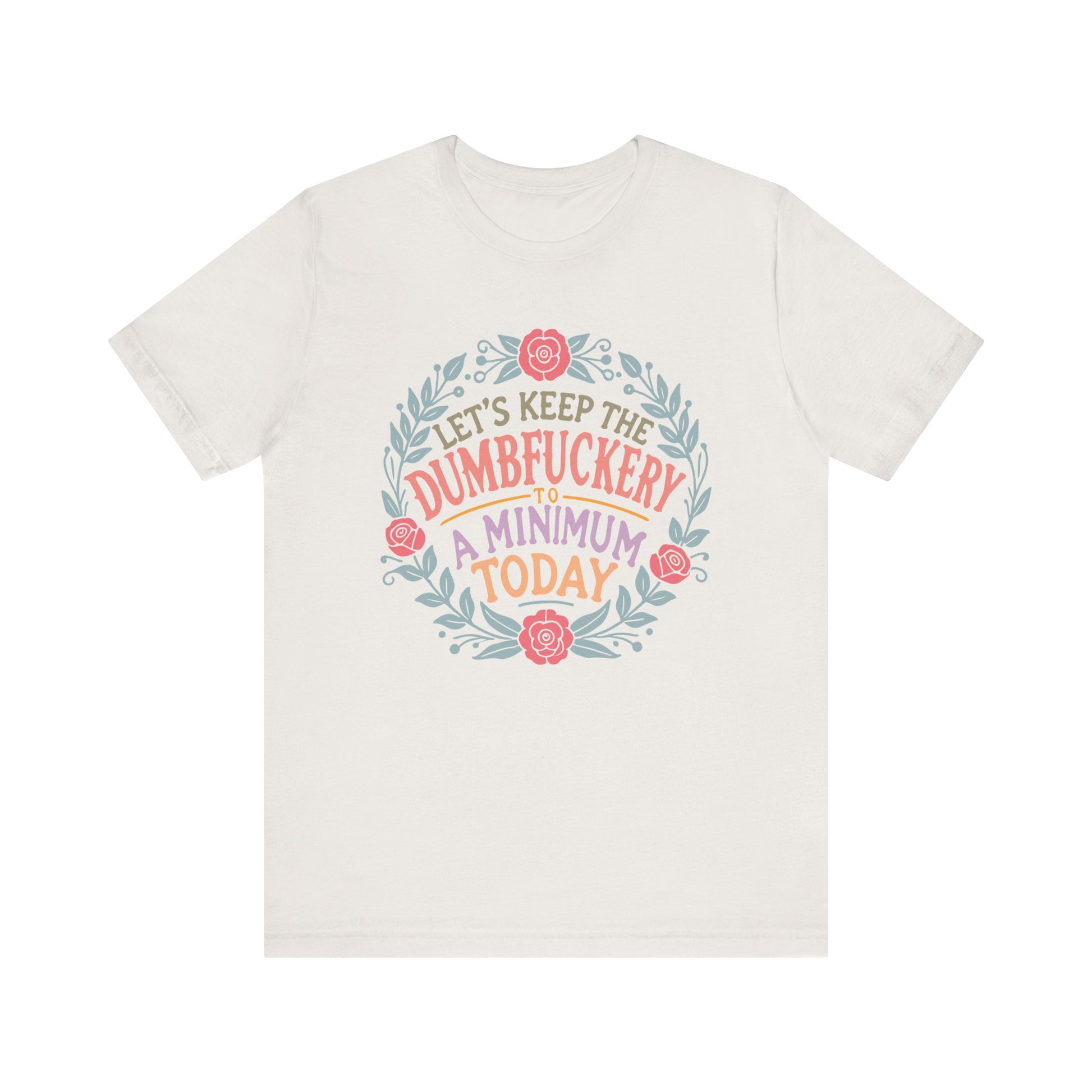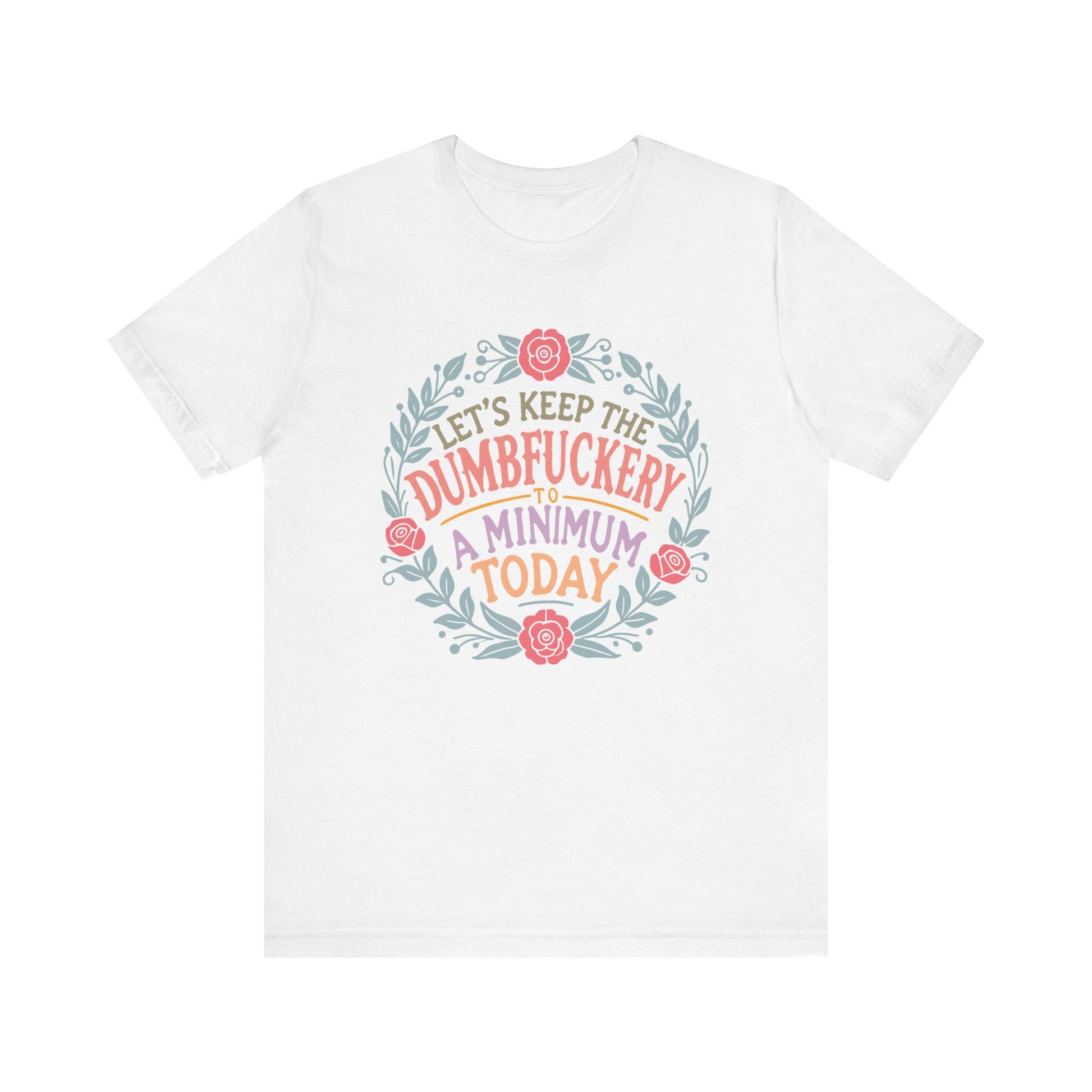 A funny and relatable T-Shirt for moms, featuring the phrase 'LET'S KEEP THE DUMBFUCKERY TO A MINIMUM'. This T-Shirt gives off a light-hearted and humorous vibe, perfect for casual wear and social gatherings. Relevant for Mother's Day, birthdays, or just to add some fun to everyday life. Targeted towards moms with a good sense of humor.