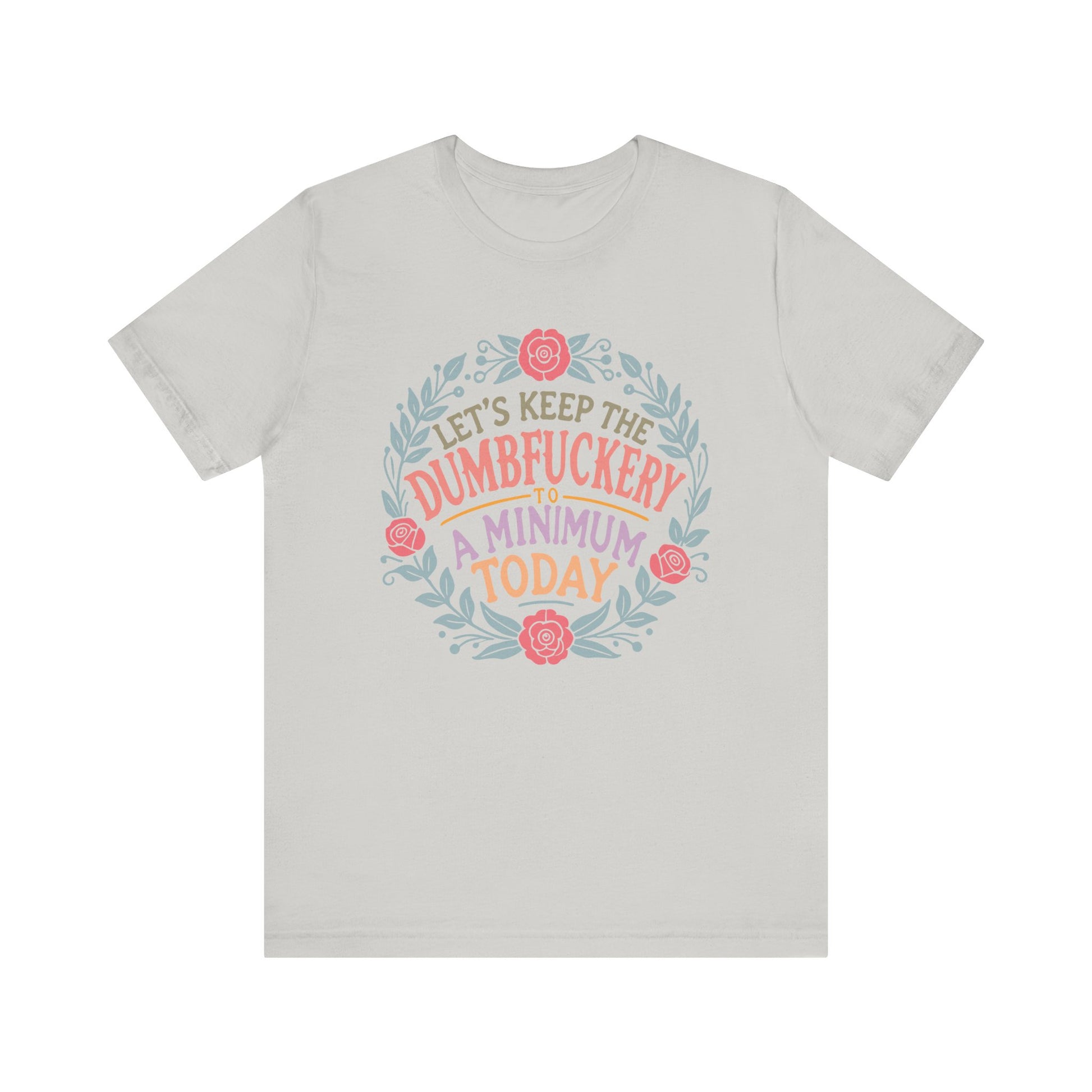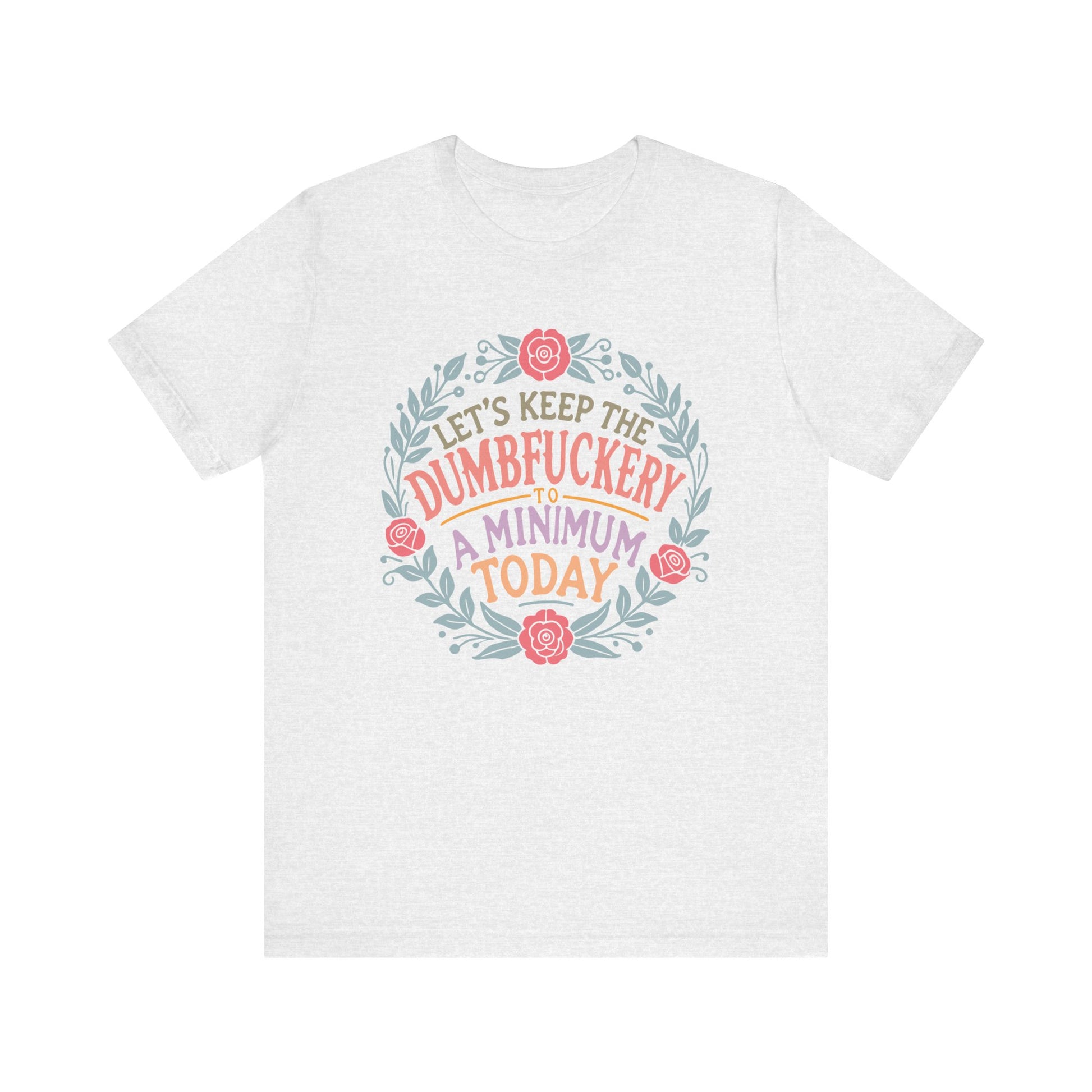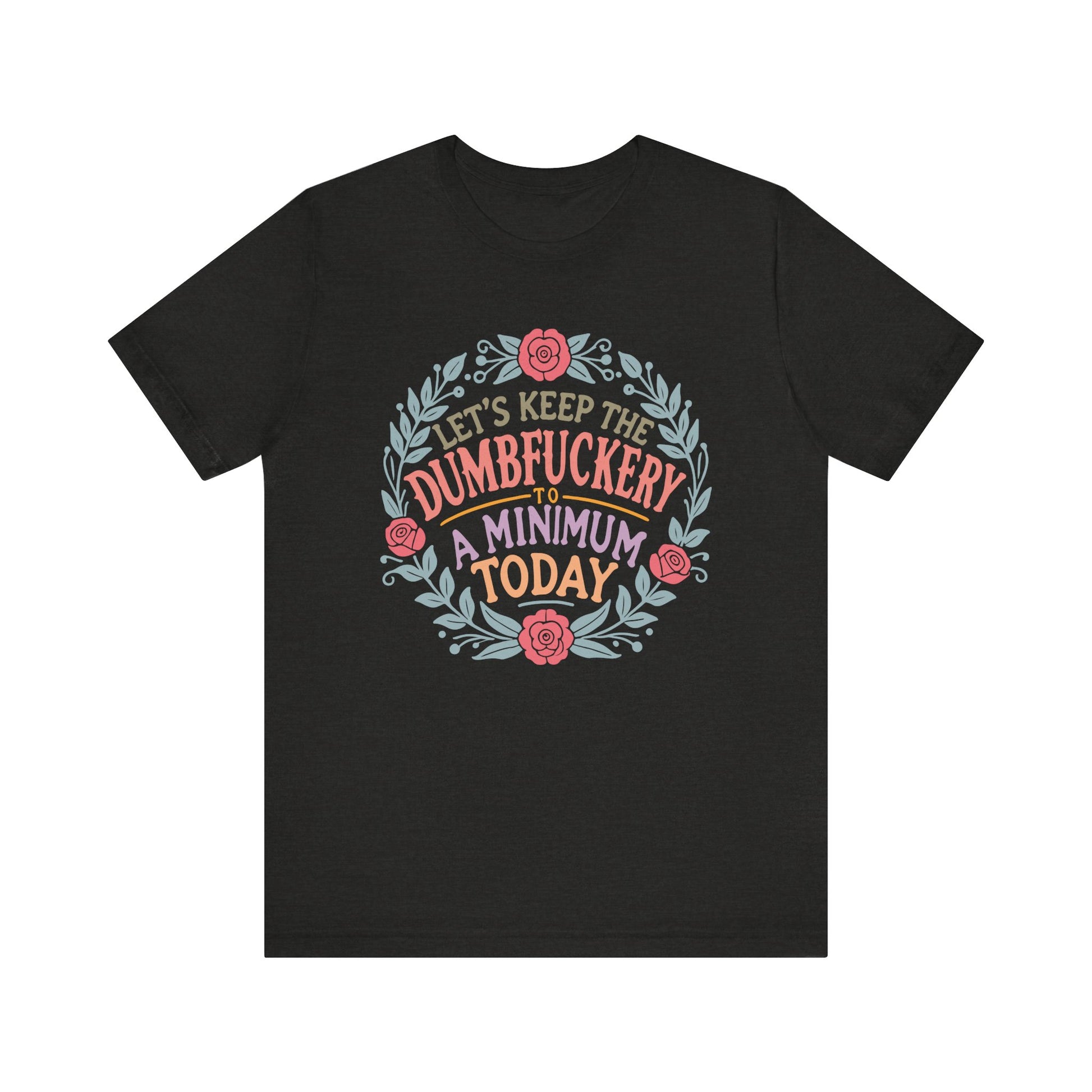 A funny and relatable T-Shirt for moms, featuring the phrase 'LET'S KEEP THE DUMBFUCKERY TO A MINIMUM'. This T-Shirt gives off a light-hearted and humorous vibe, perfect for casual wear and social gatherings. Relevant for Mother's Day, birthdays, or just to add some fun to everyday life. Targeted towards moms with a good sense of humor.