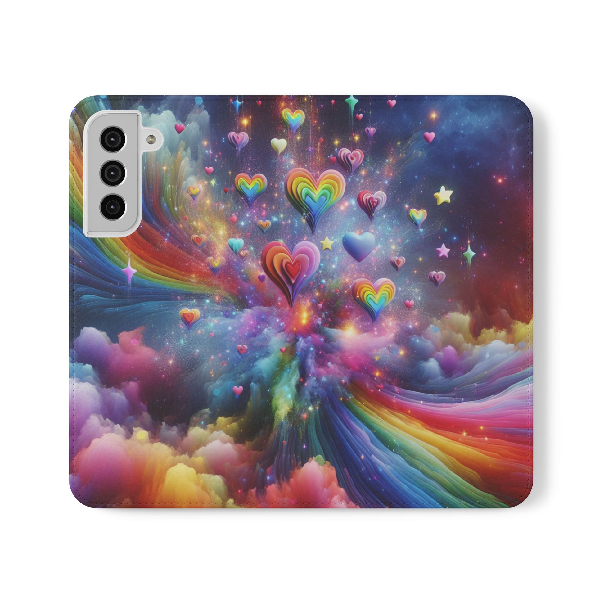 Vibrant and colorful phone case with a stylish flip design. Perfect for those who love rainbows and bright colors. Convenient compartments for storing cards and cash. Made from cruelty-free faux leather. Ideal for individuals looking to add a pop of color to their phone accessories. Great for gifting on birthdays, holidays, or any special occasion.