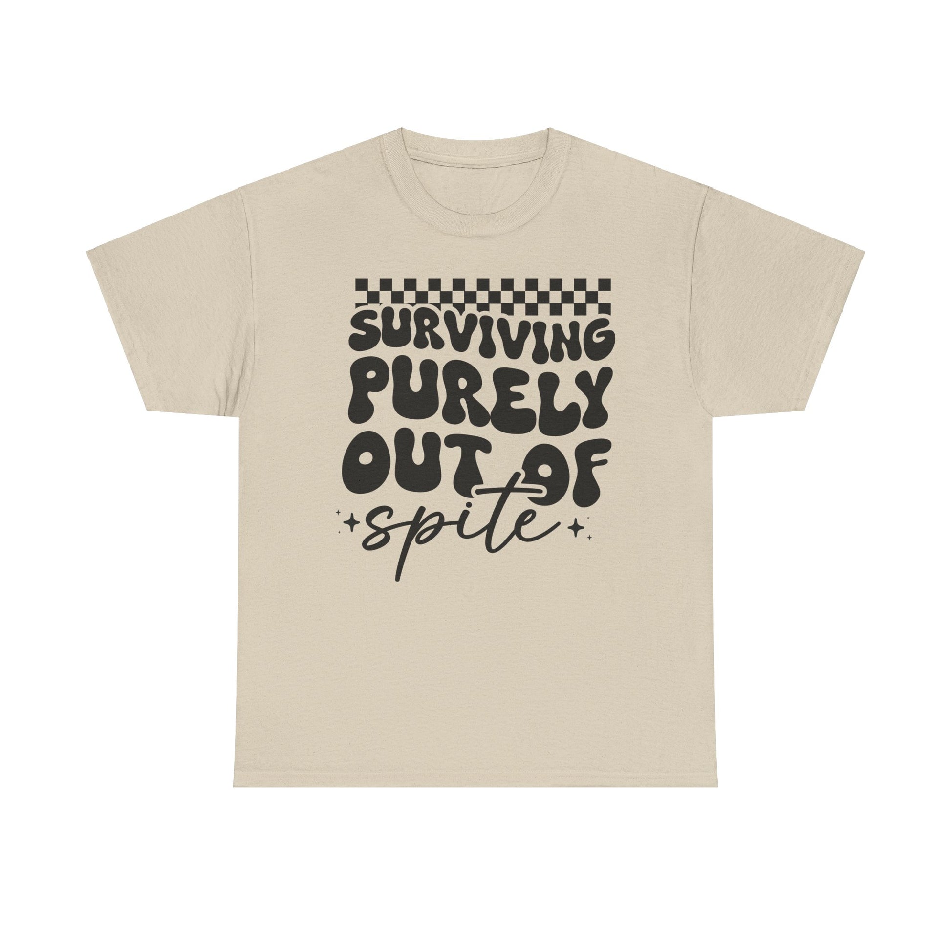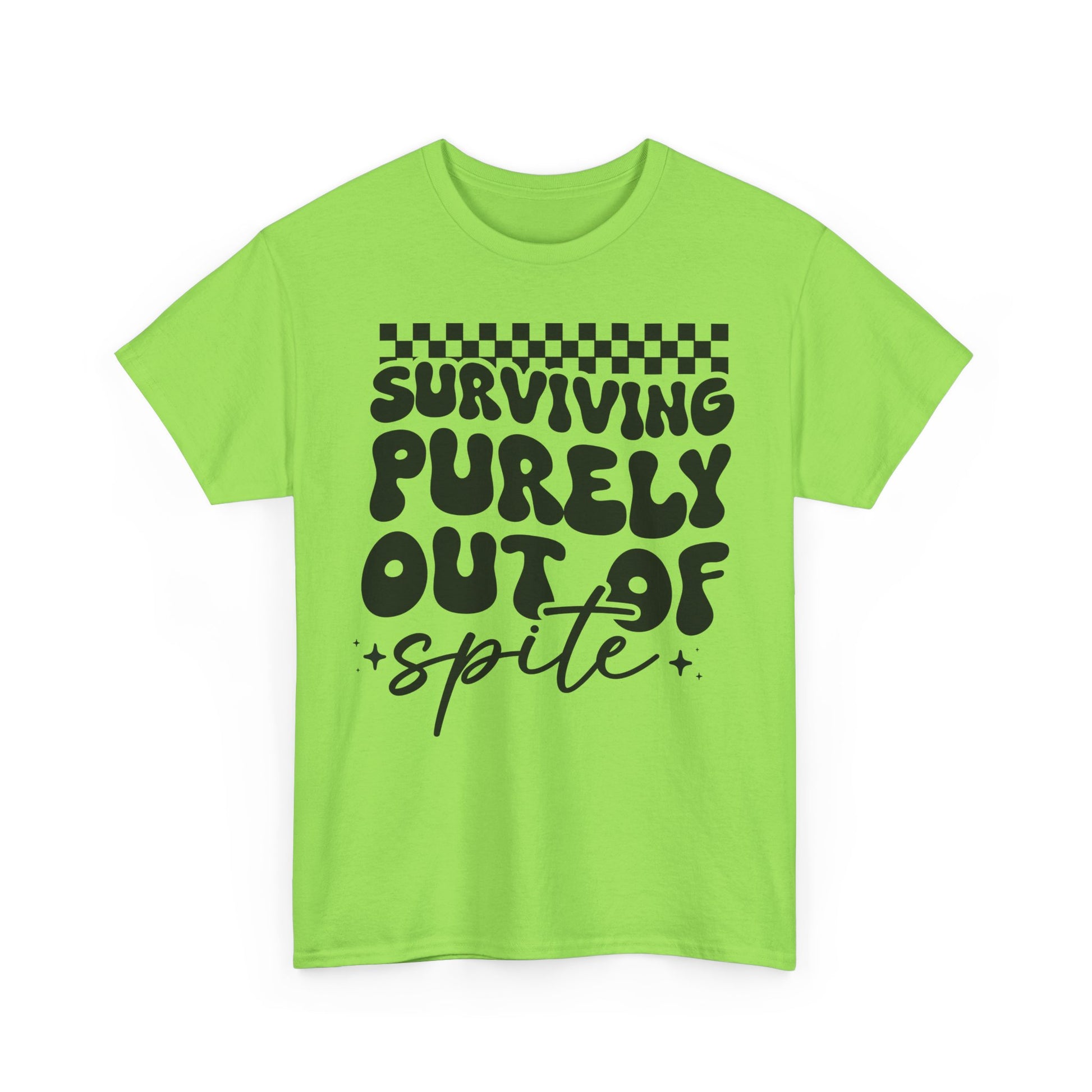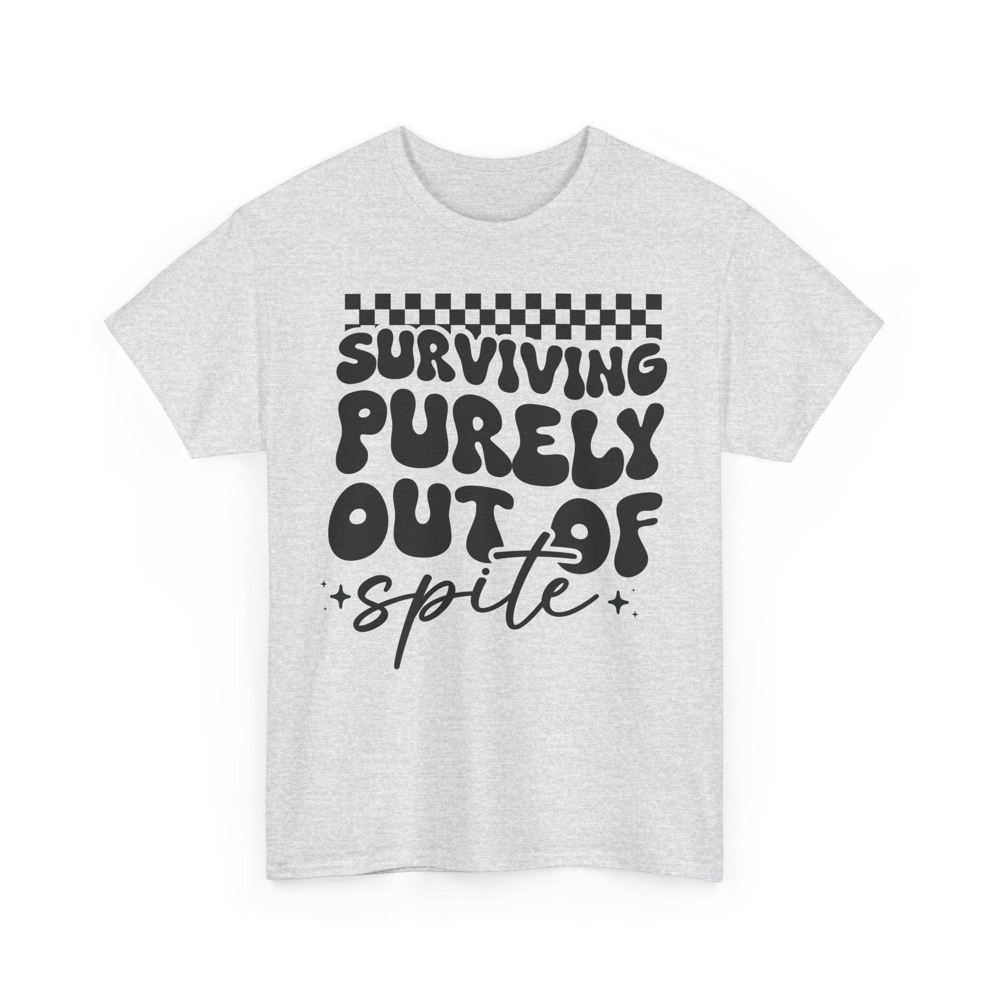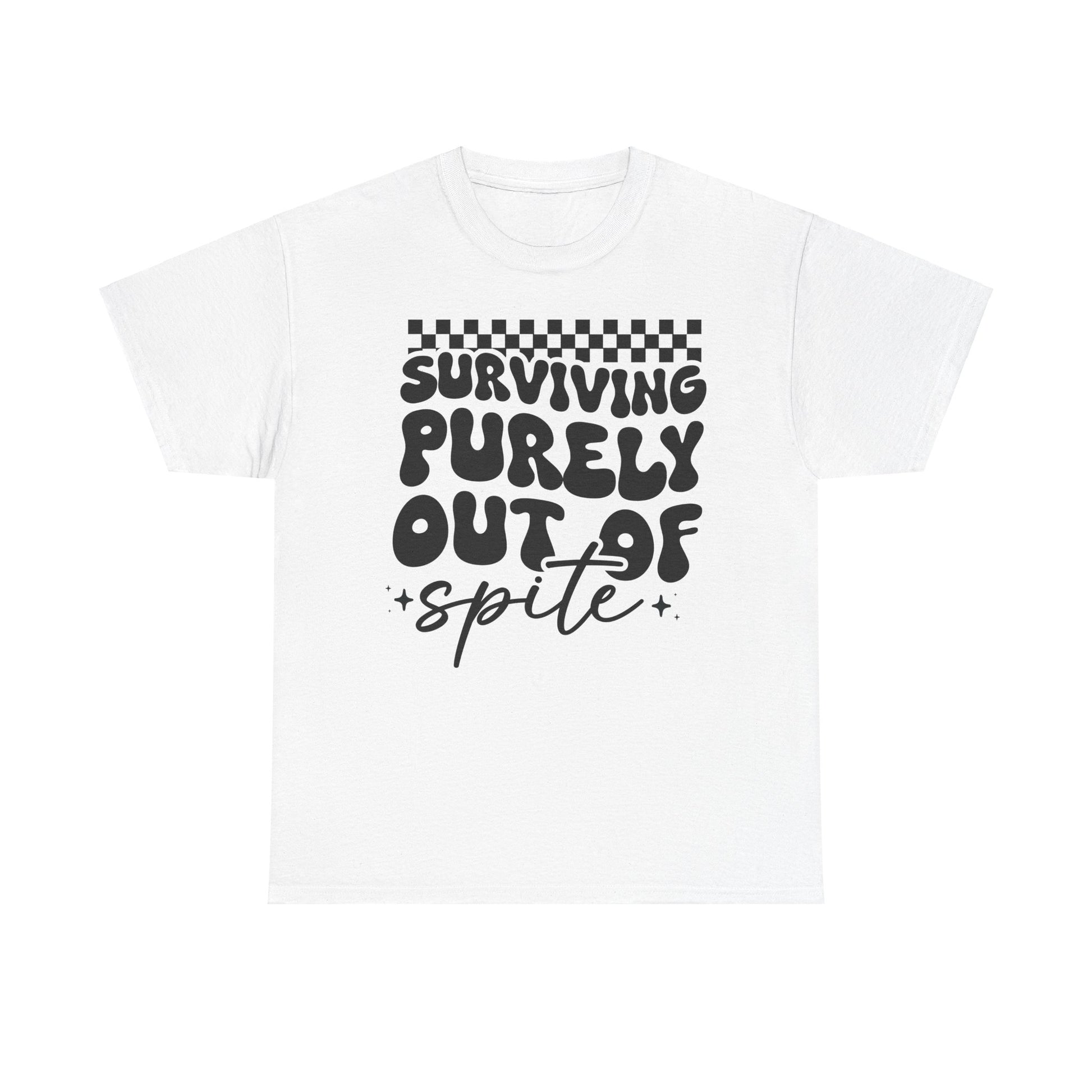 This Tee features a bold 'i SURVIVE OUT OF SPITE' design, giving off a rebellious and edgy vibe. It's perfect for individuals looking to make a statement and stand out from the crowd. Ideal for casual everyday wear or as a conversation starter at social gatherings. Relevant for occasions like music festivals, protests, or casual hangouts with friends.