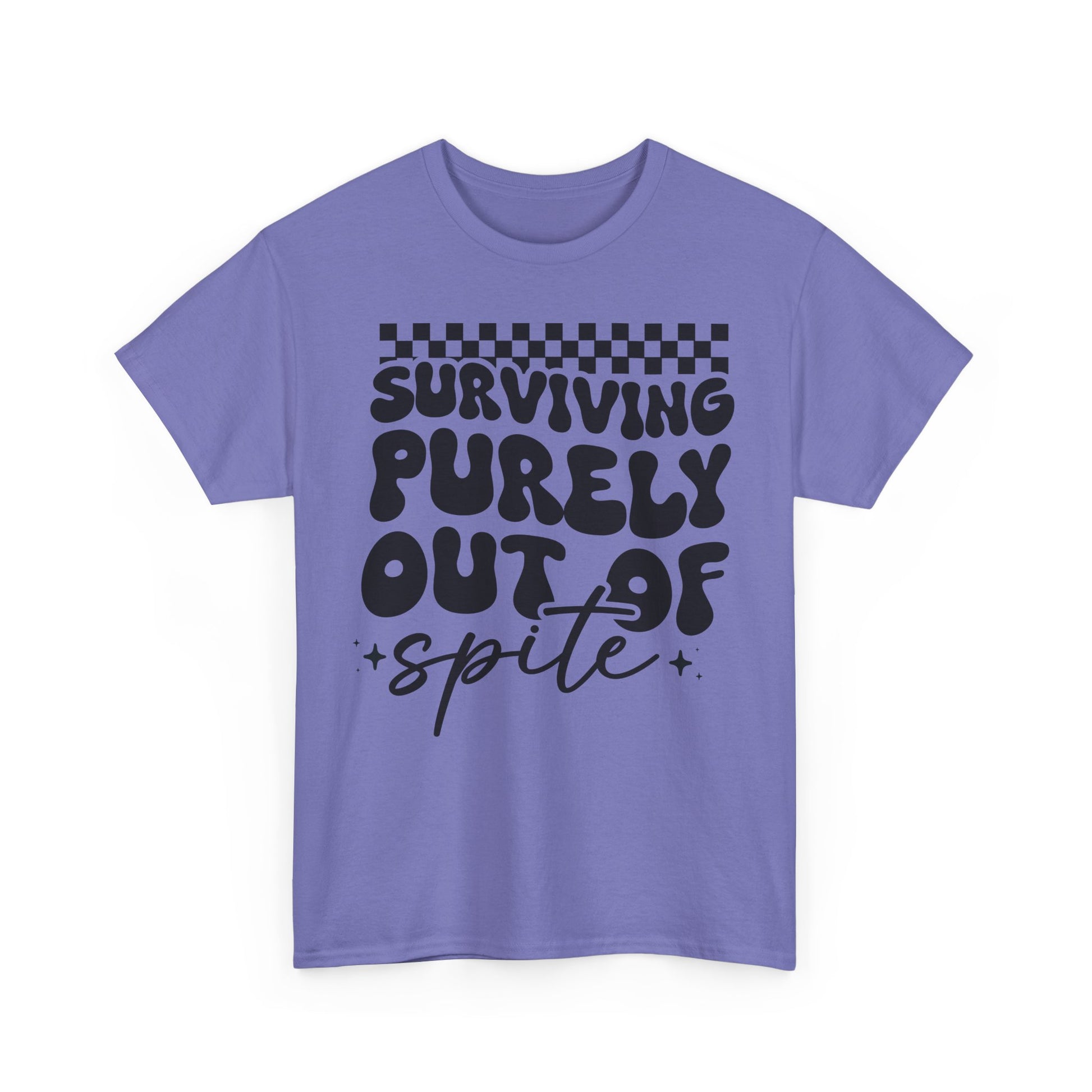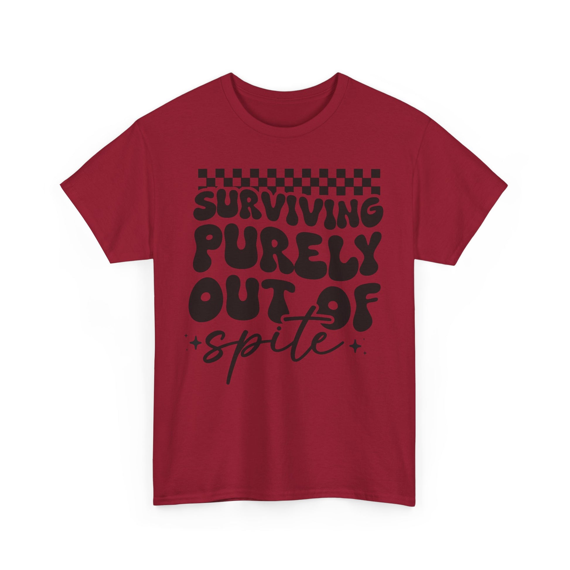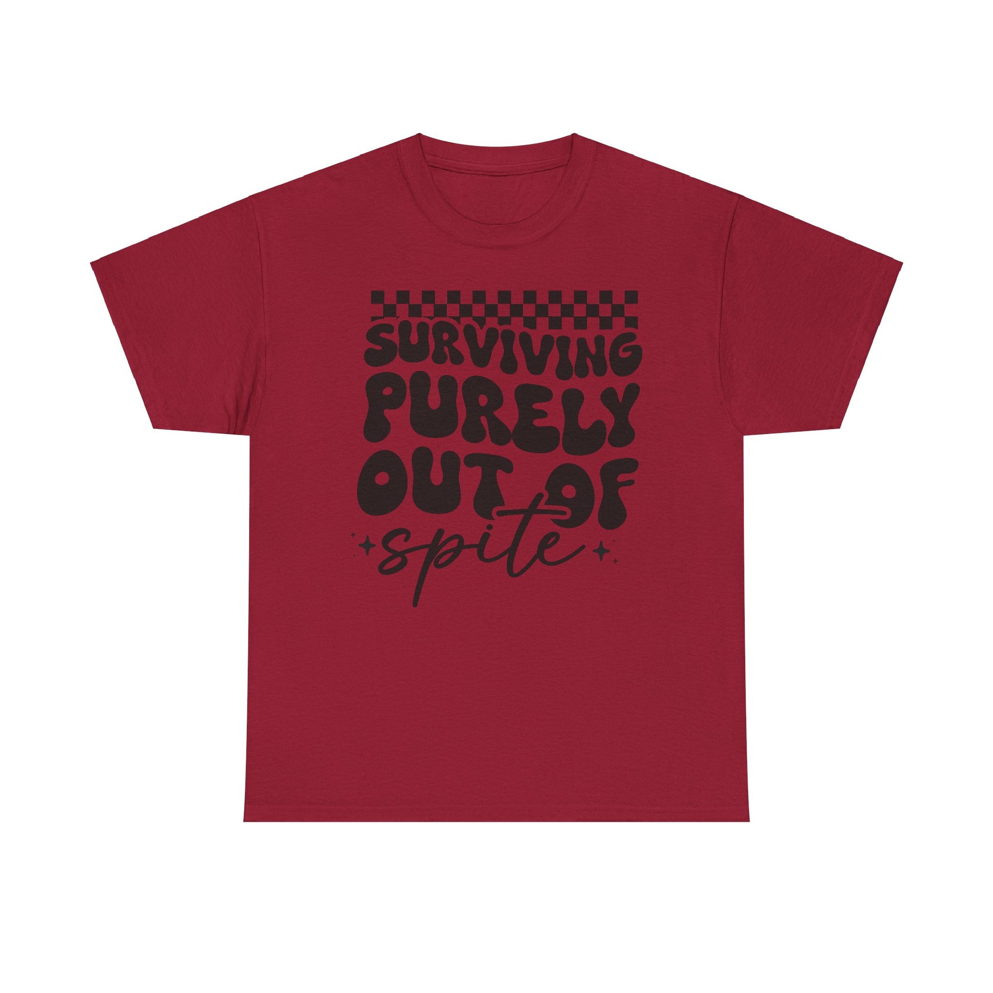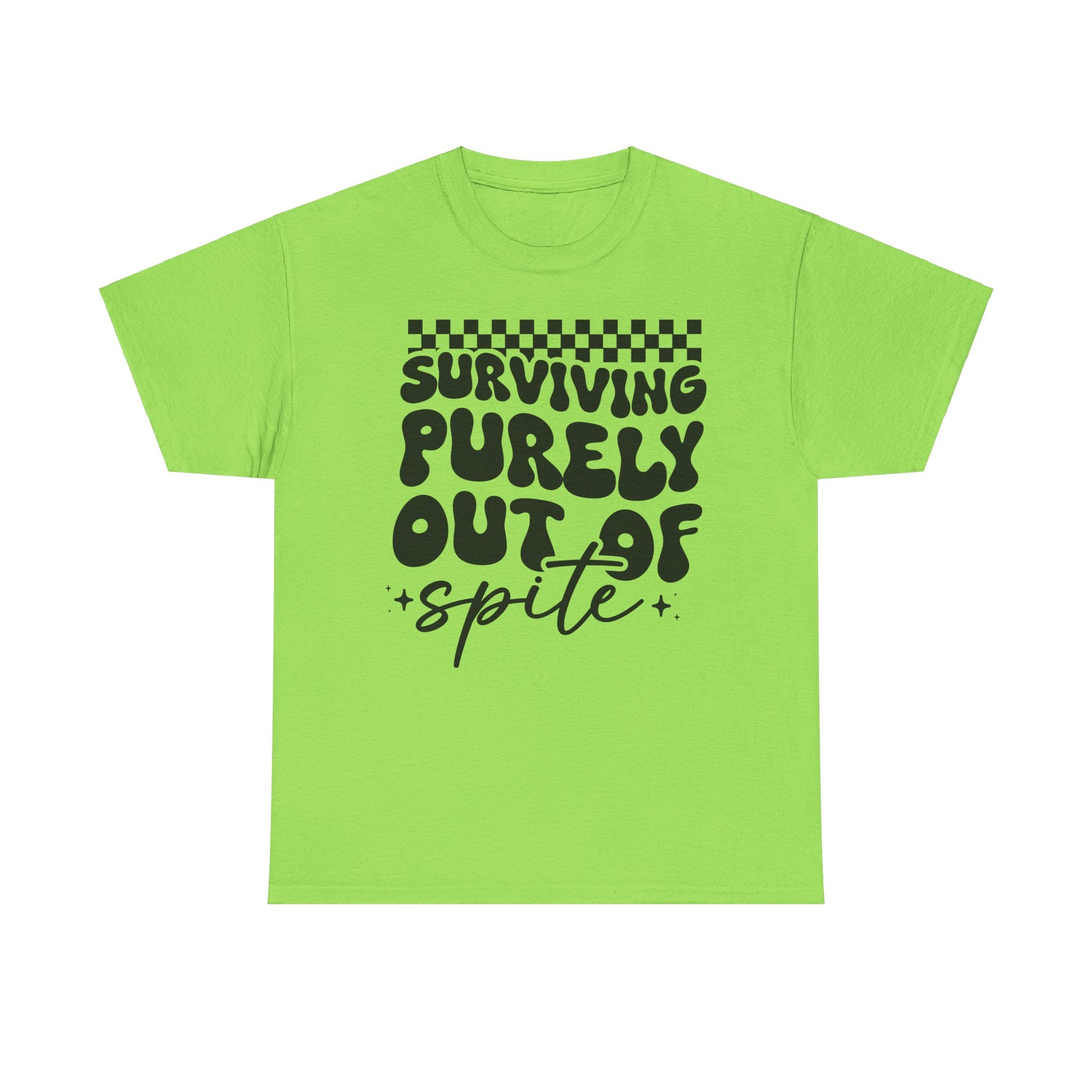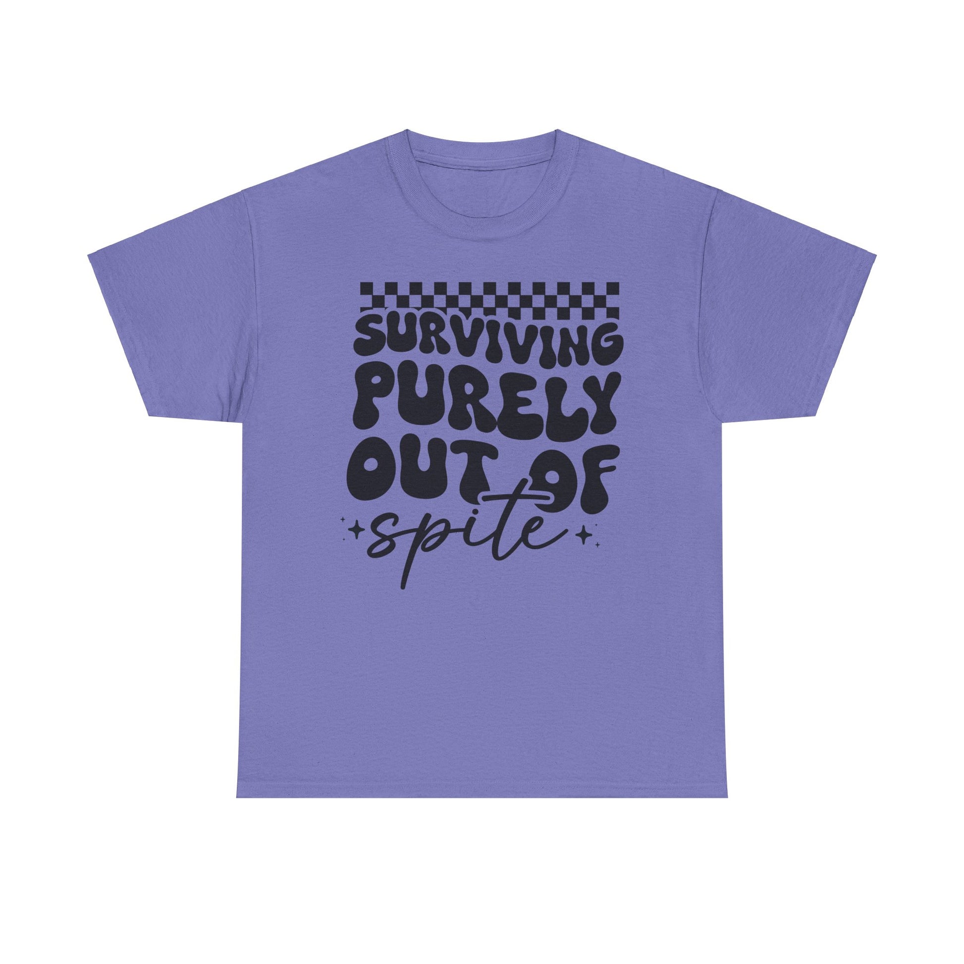 This Tee features a bold 'i SURVIVE OUT OF SPITE' design, giving off a rebellious and edgy vibe. It's perfect for individuals looking to make a statement and stand out from the crowd. Ideal for casual everyday wear or as a conversation starter at social gatherings. Relevant for occasions like music festivals, protests, or casual hangouts with friends.