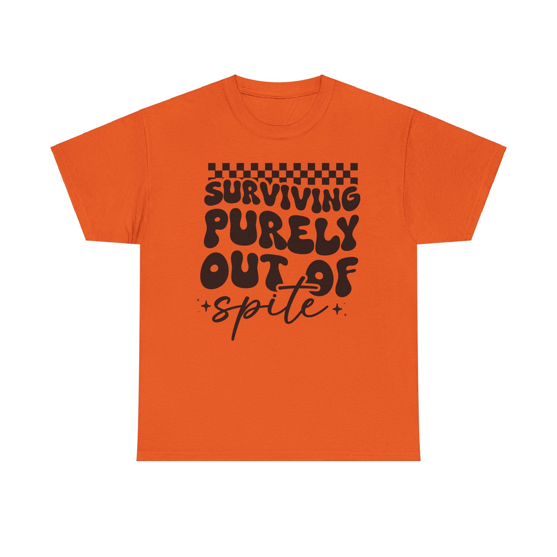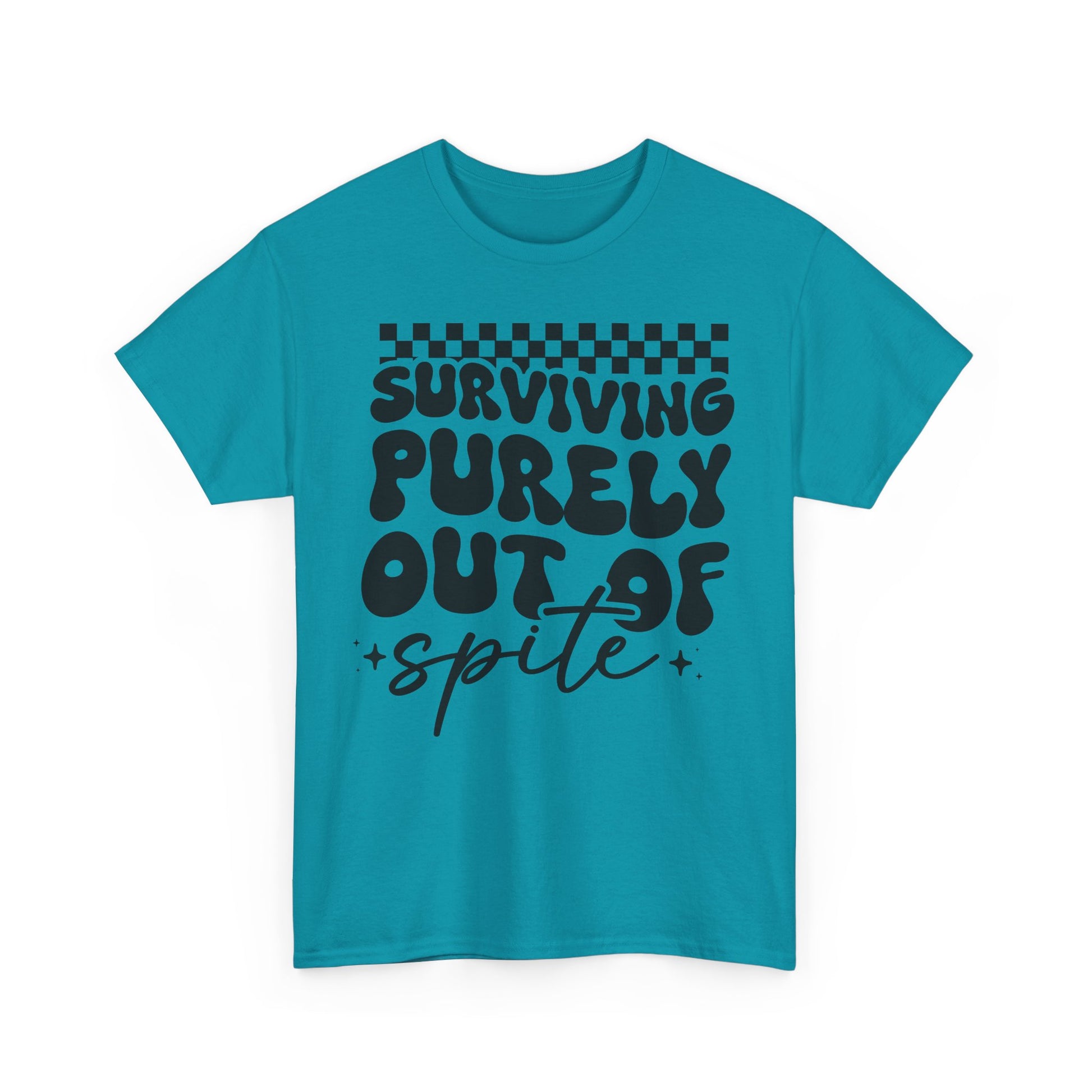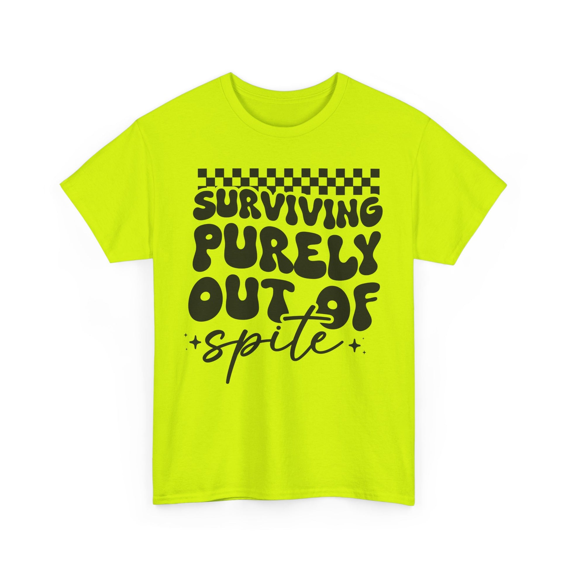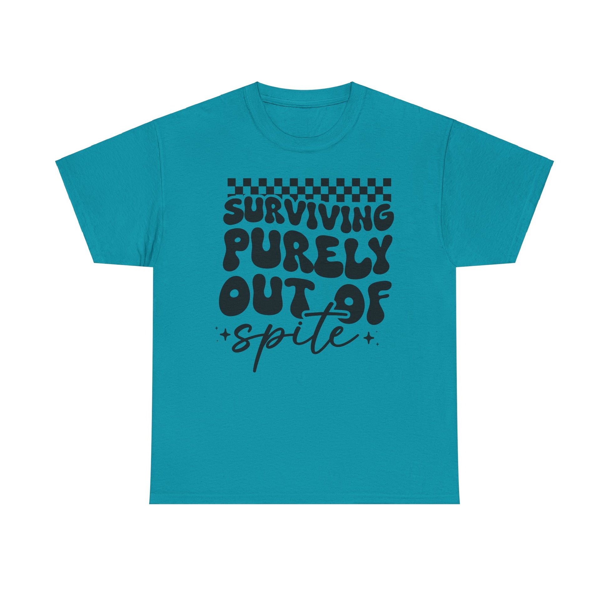 This Tee features a bold 'i SURVIVE OUT OF SPITE' design, giving off a rebellious and edgy vibe. It's perfect for individuals looking to make a statement and stand out from the crowd. Ideal for casual everyday wear or as a conversation starter at social gatherings. Relevant for occasions like music festivals, protests, or casual hangouts with friends.